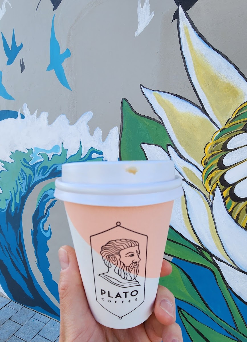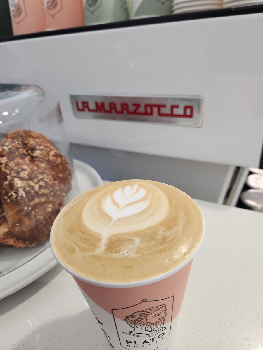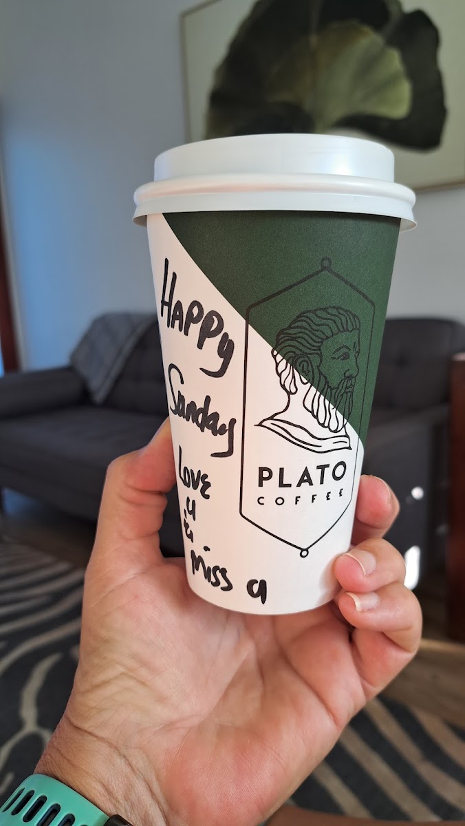 What a lovely spot for Plato! It's a quick in and out with a nice patio area in the sunshine to enjoy your beverage. Loved their dark hot chocolate and the special message on our cups from their baristas.